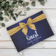 Stunning dark blue background tied with a gold bow image. Stationery is all printed, no actual ribbon. Personalize our gorgeous stationery with your event details easily and quickly, simply press the customize it button. Coordinating backside is included. Matching items to complete your event collection are available in our Zazzle store!