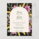 Make a dramatic and romantic statement with this dark blush pink lily arched wedding invitation. Featuring vibrant watercolor lilies, golden yellow blooms, and lush greenery set against a rich black background, this design highlights a modern curved arch layout for a sophisticated and elevated look.