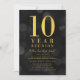 Classy class reunion invitation featuring the words "10 Year Reunion" in faux gold foil against a dark gray bokeh lights pattern background. Invitation has a dark gray background back side.