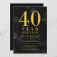 Classy class reunion invitation featuring the words "40 Year Reunion" in faux gold foil against a dark gray bokeh lights pattern background. Invitation has a dark gray background back side.