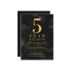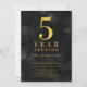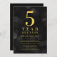 Classy class reunion invitation featuring the words "5 Year Reunion" in faux gold foil against a dark gray bokeh lights pattern background. Invitation has a dark gray background back side.