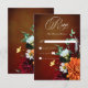 Celebrate the beginning of your forever with invitations as breathtaking as the sunset itself! Introducing our stunning sunset inspired wedding response cards without dinner choices, adorned with a vibrant spray of realistic flowers in hues of orange, yellow, red, and pink, perfectly mirroring the colors of a picturesque sunset. Each petal and leaf is meticulously crafted to exude the beauty of nature, with dark sage green foliage providing the perfect backdrop to the fiery hues of the flowers. The soft white text delicately floats on a slightly distressed copper-colored background, adding a touch of rustic elegance to your invitations. Created by Simply Farmhouse Press.