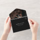 Announce your day in style with this modern minimalist all-in-one wedding invitation, featuring a dark faded photo overlay, elegant monogram initials, and QR code RSVP for your online wedding website. Designed with simple typography and calligraphy script, this seal-and-send format is romantic, sleek, and perfect for a black and white celebration.