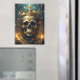 This artwork features an ornate skull adorned with a regal crown, intricately entwined with lush vines and vibrant flowers. Flickering candles add a mystical glow, casting dynamic shadows that bring the scene to life. All of this is set against a serene forest backdrop, creating a striking balance between beauty and mystery.
