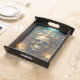 This is a well made, sturdy wooden tray with a flawless black finish and lovely map on the tray surface. It is both vintage & modern at the same time. Looks exactly like the photo; does not disappoint. So nice to find something of quality individually made and not the mass-produced 'shabby chic' merchandise seen in stores. I am so pleased to be able to give this to my college-age niece for her birthday. This can be used as a tray to hold jewelry or toiletries, or hung on the wall as art. The map surface is sealed (it is slightly shiny) so would be moisture resistant. It is well worth the asking price but I was able to apply a sale code as well. Very happy with my purchase. Map is crisp & clear and sealed with a water-resitant finish.