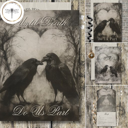 Step into the enigmatic embrace of your love story with our dark and moody gothic wedding invitation suite. Capturing the essence of mystery and romance, our wedding response card with QR code features a captivating image in a charcoal style, showcasing two majestic black ravens locked in a tender beak-to-beak embrace amidst twisted bare trees. Behind them, a soft, misty backdrop adorned with a heart of branches sets the scene for your unique union. The back, adorned with a matching tan moire taffeta background and vintage font, adds a touch of timeless elegance. Invite your guests to share in the intrigue and allure of your special day with this unforgettable invitation suite. Created by Simply Farmhouse Press.