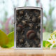 A highly detailed and ornate 2D digital illustration featuring a seamless botanical pattern in a dark gothic or Baroque style. The design showcases textured thistle-like seed pods with feathery reddish-brown tops and swirling, acanthus-inspired leaves in muted bronze and charcoal tones. Set against a deep black, subtly patterned background.