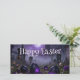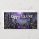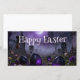 A mysterious Easter scene set in a foggy graveyard with glowing purple eggs and a gothic cathedral in the background. Dark tones, misty atmosphere and eerie lighting create a unique, haunting twist on traditional Easter imagery.