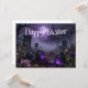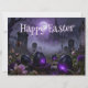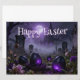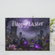 A mysterious Easter scene set in a foggy graveyard with glowing purple eggs and a gothic cathedral in the background. Dark tones, misty atmosphere and eerie lighting create a unique, haunting twist on traditional Easter imagery.