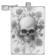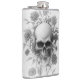 A dark and gothic black and white depiction of a bare white skull resting in a collection of black roses, dead leaves and sharp prickly thorns.
