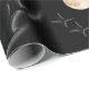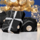 Bold dark aesthetic wrapping paper featuring abstract curved shapes, subtle stars, and soft gold accents on a matte black background.