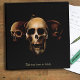 A haunting composition featuring three shadow-drenched skulls emerging from darkness, crowned by a mysterious creeping creature perched atop the central figure. This gothic horror artwork blends macabre symbolism with an ominous, cinematic atmosphere—perfect for fans of dark fantasy, Halloween aesthetics, and eerie statement designs. Ideal for those who love the unsettling beauty of the unknown and the whisper of something lurking just out of sight.