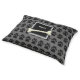 Dark gray dog bed with pattern of dog paws, dog bone and monogram.