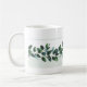 Extraordinary, ethereal modern watercolor eucalyptus leaves, dark green, and paler blue, banding a classic mug trimmed with a pastel mint texture image.