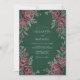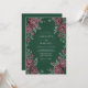 This design features a deep forest green backdrop that contrasts beautifully with rich burgundy roses. Delicate silver-toned leaves and botanical stems adorn the layout, creating a moody and sophisticated aesthetic for a formal winter affair. The lush floral arrangement includes open blooms and small buds for a refined look.