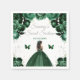 This elegant and glamorous sweet sixteen napkin features a beautiful princess with dark skin in a dark green ball gown. The text combines handwritten script and modern sans serif fonts for a classy and sophisticated look. The floral arrangements, butterfly and silver confetti create the perfect blend of rustic and chic.
