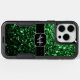 Dark green sparkles Monogram iPhone 15 Case. Personalize with your initial and name. Trendy OtterBox phone case with Beautiful girly glamorous green shiny glitters sparkles. Photo of sparkles glitter!