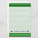 This stationery design features a pattern of light green and dark green stripes/lines. It also features a customizable name near the bottom, between heart shapes. [~Z0000011]