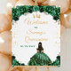 This elegant and glamorous Quinceañera welcome sign features a beautiful princess with dark hair in a dark green ball gown. The text combines handwritten script and modern sans serif fonts for a classy and sophisticated look. The floral arrangements and gold confetti create the perfect blend of rustic and chic.