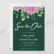Dark Green watercolor pink roses with white handwritten font customizable "Save the Date" invitation. This design features beautiful pink roses and a large calligraphy style font which you can change to any other color you like. You can also personalize all details and text colors on this Save the Date template.