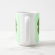 Painting of a green shamrock, four leaf clover, centered in an outline drawing of a four leaf clover, printed on two sides of a mug. The background color can be changed. To choose a different background color, click on Customize It, then on Edit, then on Background, and then on the color of your choice. The Border color is the edge color.