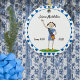 Customizable name, troop number and year for this cute, dark haired, cadette in ponytails wearing a blue uniform and sash, red cookie box, standing in grass waving. A blue heart shape pattern borders the ornament.