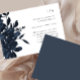 Elegant dark indigo blue change the date wedding postponement announcement. This beautiful blue and white watercolor announcement is a chic way to let invited guests know that your wedding date is being rescheduled due to unforeseen circumstances, and features a dark blue back of the card.