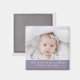 This fridge magnet features a contemporary styled font "Hello, Baby" at the bottom edge of the your own baby photo above a dark mauve purple background with your baby's name and birth date in a modern clean crisp printed white font.