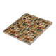 Sophisticated mid-century geometric pattern ceramic tile featuring layered circles, arches, triangles, and rectangles in forest green, burnt orange, ochre, and cream on a black background. Rich textures and retro-modern shapes create a bold design ideal for Bauhaus lovers, vintage décor fans, and anyone drawn to moody modern style.