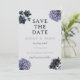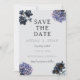 A bold and sophisticated Save the Date featuring dramatic dusty blue and grey floral illustrations against a stark black background. The crisp white typography and classic layout set an elegant, moody tone. Perfect for a formal evening or a sophisticated wedding.