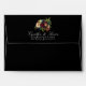 Dark moody black floral liner envelopes with a return address on the back. Fully customizable. Option to remove return address. Burgundy, purple, blue, pink and white flowers in a bouquet featured on the inside liner and the back top flap above the return address. The flower bouquets are scalable. Black color of the envelope can be changed to any color.