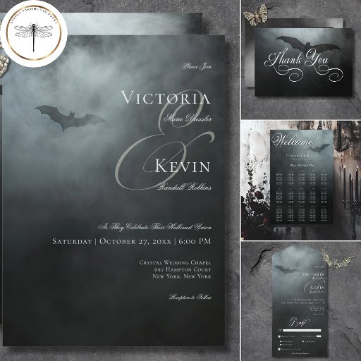 Dark Moody Midnight Bat & Fog Dinner Wedding All In One Invitation