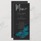 This wedding menu design features a dark, moody theme that is simple, yet stunning. A dark charcoal black background is the perfect canvas for a single teal blue moth, its wings spread for flight. Unique and elegant, this design can be used for any season. Created by Simply Farmhouse Press.