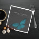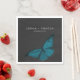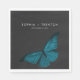 This wedding napkin design features a dark, moody theme that is simple, yet stunning. A dark charcoal black background is the perfect canvas for a single teal blue moth, its wings spread for flight. Unique and elegant, this design can be used for any season. Created by Simply Farmhouse Press.