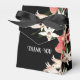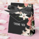 This favor bag brings a touch of elegance with a dark, sophisticated flair. The black background highlights soft florals in blush and white, while a simple “Thank You” message adds understated charm. Finished with a sleek black ribbon, it’s perfect for events with a refined, moody aesthetic.