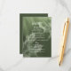 This fall wedding details card has a dark moss green color theme featuring subtle monochromatic maple leaves accenting a flowing light to dark earthy green gradient - by katz_d_zynes