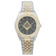 Stylish gold square and compass Masonic symbol personalized wrist watch with a dark plaid background.