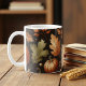A dark pumpkin pattern mug featuring a moody watercolor autumn design with falling leaves. Ideal for pumpkin spice latte lovers or as a cute seasonal gift.