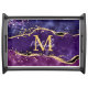 This serving tray features an elegant and glamorous dark purple agate marble background with faux gold glitter accents. The monogram combines handwritten script and modern sans serif fonts for a classy and sophisticated look. This will make the ideal gift as it can be customized with a name and initial. The sequins and distressed texture creates the perfect blend of chic and grunge.