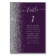 The left-hand edge of this elegant modern wedding table number card features a silver faux glitter border. The word "table" appears in silver gray whimsical handwriting script on a dark purple background. Add the names of your guests who are assigned to each table.