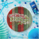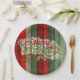Beautiful, unique, classic, trendy, pretty and decorative Christmas holiday greeting paper plate with a classic Holiday dark red, forest green, and white colored 'Merry Christmas' quote text on a rustic weathered wooden country cottage farmhouse style planks pattern background.