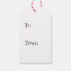 This gift tag from Dogwood & Thistle features a custom seasonal greeting (currently "Merry Christmas") in a fun font on a dark red background with a dotted trim. The other side has "To:" and "From:" in the same fun font.