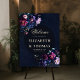 A floral arrangement of dark moody florals in jewel tones frames this stunning wedding welcome foam board with a dark romantic theme. A dark navy background and rich black arch are the background for classic typography and touches of elegant calligraphy in a gold hue (digital effect, not real gold). A perfect choice for couples who love the dark romance wedding vibe and the jewel tone aesthetic. A dark and moody wedding welcome that infuses hints of color and gives a wide range of color choices to match a black wedding gown. Elegant and romantic, this is a modern classic wedding welcome is for lovers of floral paintings in the style of Dutch masters, gothic weddings, dark wedding designs, moody dark romance and dark romantic florals in jewel tones.