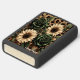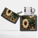 A-BRIGHT BOLD VIVID COLORS. Depicts ROSES with olive green petals and dark brown centers, next to cream flowers with dark green centers/veining. Background is a bronze glitter forest green leopard print intertwined with smaller olive/brown sunflowers. Central rectangular label reads 'you can personalize with your name'.