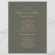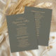 Double-sided dark sage green wedding program/bridal party listing. The front of this program has the names of the bride and groom and their wedding date along with a thank you message to your guests. It gives the schedule of the ceremony. On the back, you have space to add the names of your bridal party.