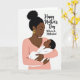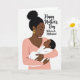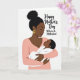 This greeting card shows a close, quiet moment between a mother and her newborn, drawn in a modern, graphic look that feels intimate and calm ❤️. The mother has deep brown skin, her hair gathered into a high bun, and her eyes softly closed as she tilts her face toward the baby with a tender, protective expression. Large round golden earrings add a warm glow beside her cheeks, and she wears a soft pink V-neck top that frames the baby in her arms. The infant, with matching deep skin tones, rests snugly against her chest, eyes closed, wrapped in bright white fabric that looks smooth and airy. The open white background keeps the focus on their closeness, like they’re sharing a private breath together. In the upper right, the words “Happy Mother’s Day” and “Welcome to Motherhood” appear in bold black lettering, stacked neatly to balance the figures on the left. Gentle contrasts—gold earrings, pink clothing, and the white swaddle—create a soothing palette that pairs well with a small 🌼 accent. The baby’s swaddle is crisp white, with the folds curving along the mother’s forearm against the plain white backdrop.