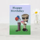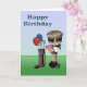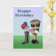 This birthday card has a cute card for a young person who plays golf. The graphic is a tween aged child with dark skin, holding a birthday cake and golf club with balloons. You can edit the inside text.