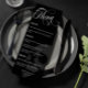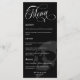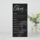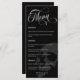 Goth wedding menu in shades of charcoal, black, and white with a skull and pretty fonts.