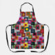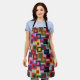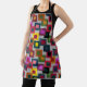 This apron has a geometric design of squares inside squares in brown, black, brick, yellow, teal, green, purple, yellow, gold, pink, red, gray on a field of lighter gray.