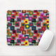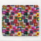 This mouse pad has a geometric design of squares inside squares in brown, black, brick, yellow, teal, green, purple, gold, pink, red, gray on a field of lighter gray.